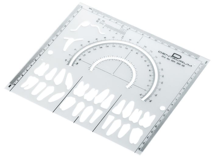For evaluation of radiographs. With mm scale, protractor and cut out tooth symbols for tracing.