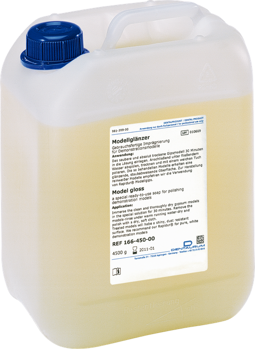 Environmentally friendly impregnation liquid for plaster demonstration models (e.g. Rapidur®, REF 164-450-00) for shiny, dust-repellent surfaces.