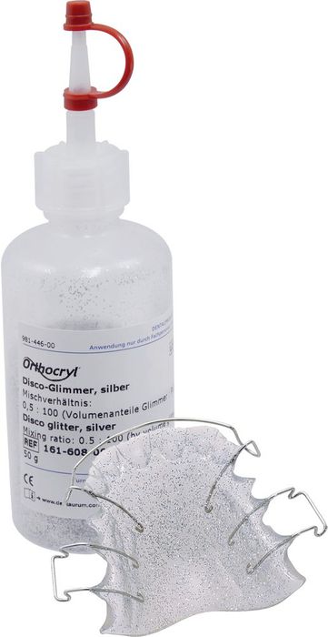 For coloring the removable appliances. The glitter is simply added as desired to the Orthocryl® powder (polymer) to give the appliance an attractive luster. No change in the processing of Orthocryl® is necessary. The appliances can be finished and polished without difficulty.