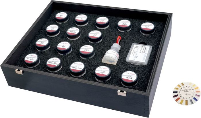 Set containing 16 stains (3 opaque shades and 13 characterization shades) for internal and external effects.