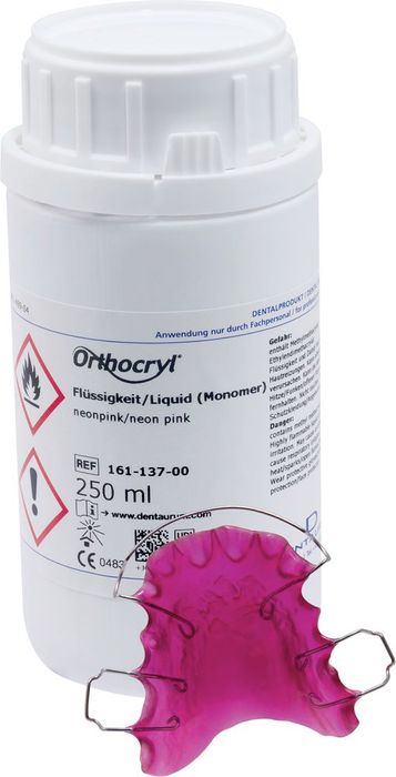 Neon-colored Orthocryl liquid (monomer) for producing brightly colored orthodontic appliances. Cold curing acrylic resin permitting the simple and economical fabrication of orthodontic appliances. Easy processing, using both the doughing and the salt-and-pepper technique in conjunction with the clear Orthocryl powder (polymer, REF 160-112-00/160-212-00). Disco glitter can also be used to enhance the effect of the colors.